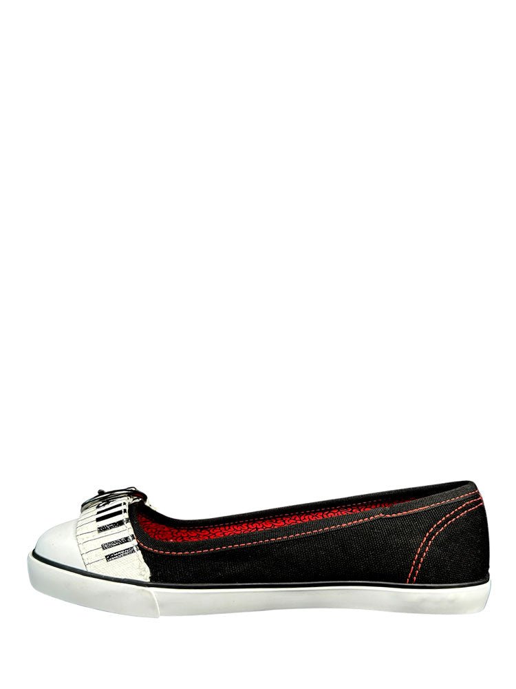 Step back into the 2000s with the Chloe Ghoulia in Black/Red. These kicks feature a sleek black canvas upper paired with a fun piano print strap just like Ghoulia's belt. A classic white rubber outsole with a protective toe cap completes the look, blending vintage vibes with modern flair. Perfect for those who love a playful twist on retro style.
