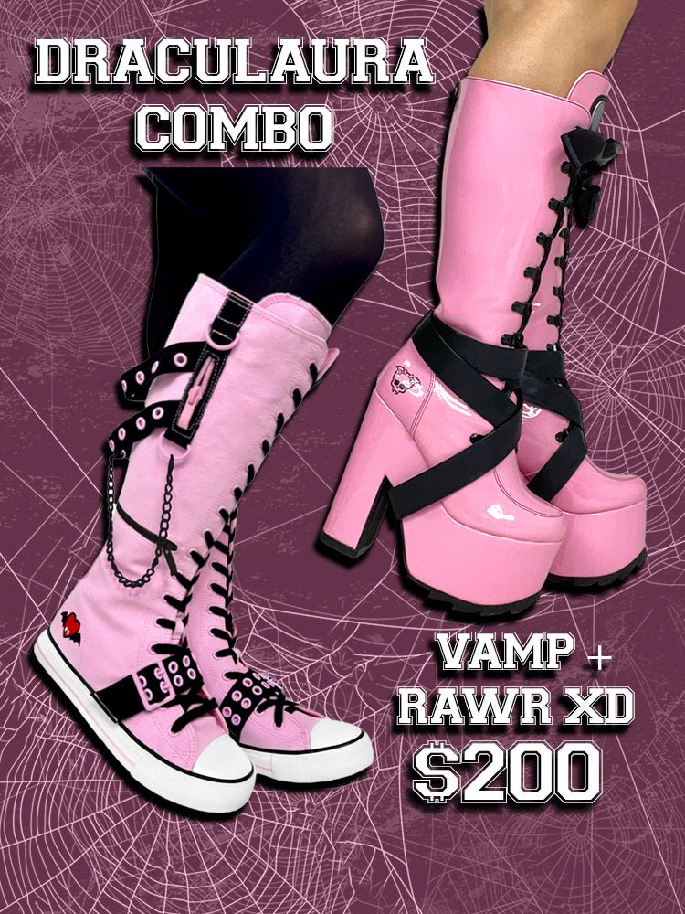 Step up your style game with the VAMP - PINK/BLACK boot inspired by Monster High’s Draculaura! This playful boot shines in vibrant pink vegan patent leather, accented by sleek black satin ribbon laces and glossy black enamel D-rings. A reflective silver heart on the tongue adds a spark of fun, while the 3-inch platform and 6.25-inch heel boost your height and attitude. Designed for comfort with an EVA sole and durable black rubber outsole, plus a convenient back zipper for easy wear. Perfect for adding a bold, edgy twist to any outfit!
