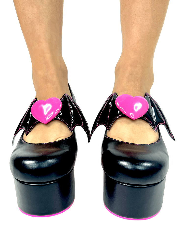 Monster High and YRU recreate Draculaura's heel, with a twist. The DEELITE DRACULAURA features a chic black vegan leather exterior, accented by a black vegan patent bat wing strap and a bold hot pink enamel heart charm. The interior is lined with vibrant hot pink vegan leather, while the EVA bottom is wrapped in black vegan leather. The hot pink rubber outsole provides a durable and stylish finishing touch.