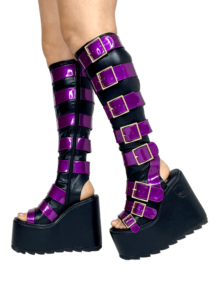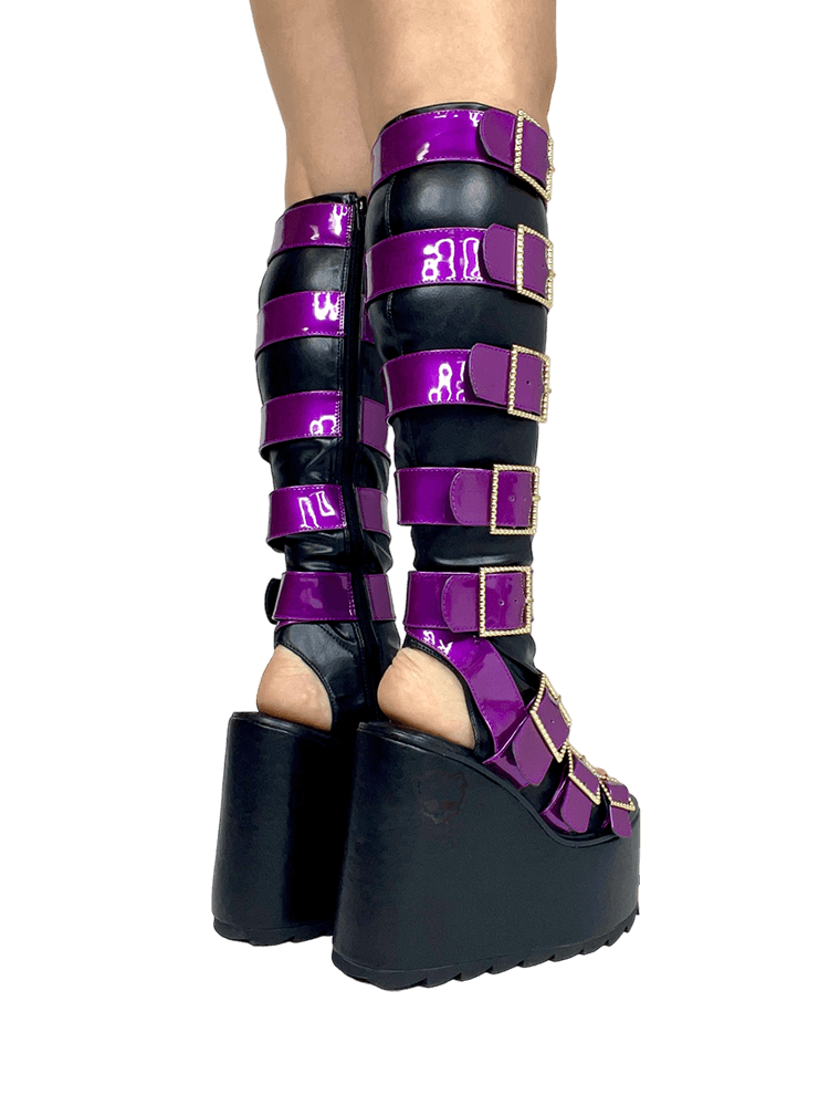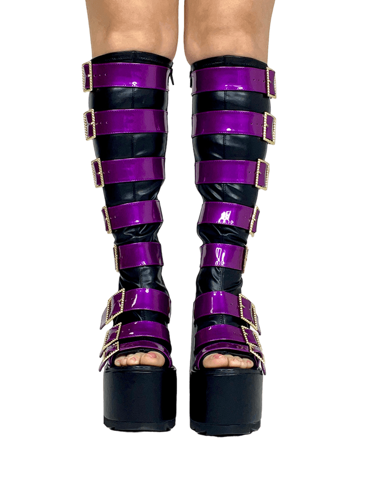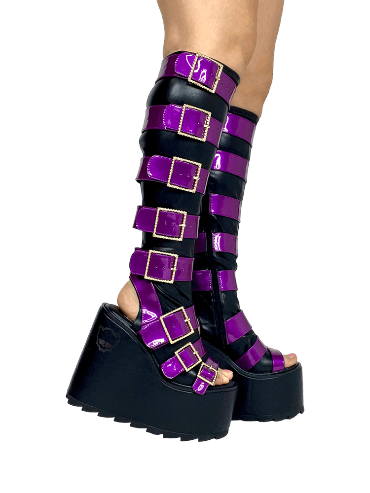 Monster High Clawdeen's shoe is brought to life. Expertly crafted with a black stretch vegan leather shaft and striking purple metallic vegan patent leather straps, adorned with gold adjustable buckles, these boots are not only stylish but also functional. The black vegan leather lining and wrapped EVA bottom provide added comfort, while the black rubber outsole ensures durability. With an inner zipper closure and a 3-inch platform heel, these boots are perfect for making a bold fashion statement.