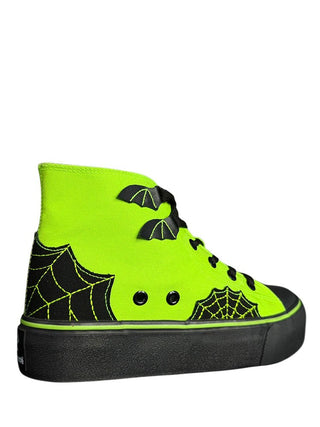 Dare to be different with HXC - GREEN/BLACK. Featuring a green canvas upper and unique black vegan leather bat wing holder detail, these shoes will take you to new heights. With a sturdy black rubber toe and outsole, along with a 1.25 inch platform bottom, you'll make a statement while feeling comfortable and confident. (Flying not included!)