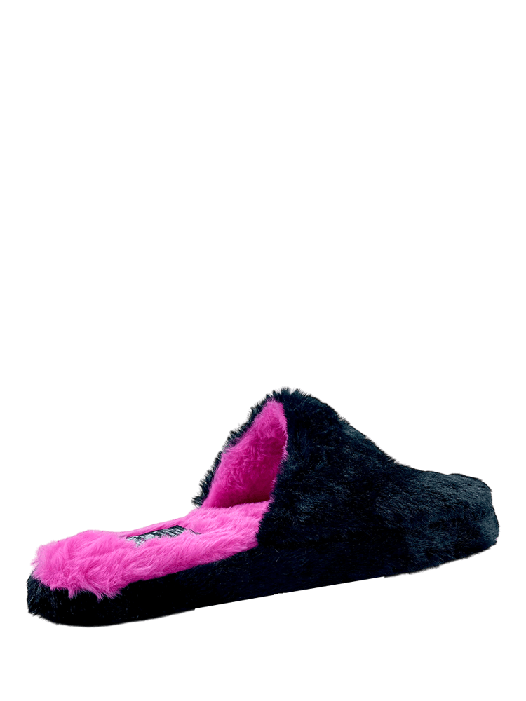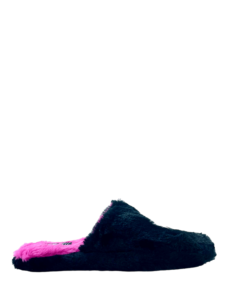 Step into fun with these Monster High slippers, featuring a black vegan fur upper, an embroidered Skullette design, a vibrant hot pink vegan fur lining, and a sturdy white rubber outsole.