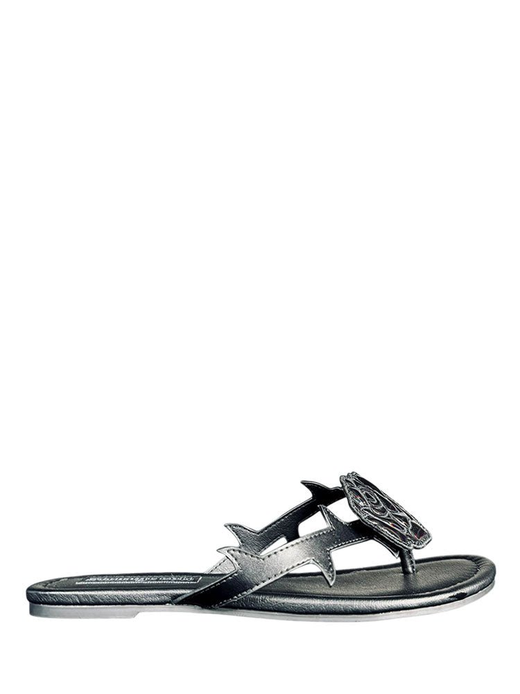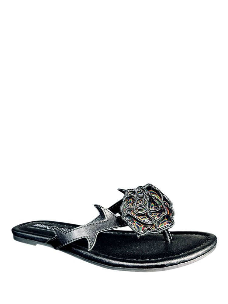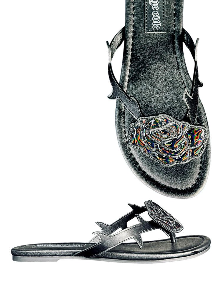 Step into dark romance with the BETTY ROSE in black. This edgy shoe features a sleek vegan leather upper paired with statement straps adorned with menacing thorn details that demand attention. A hologram rose catches the light with an iridescent shimmer, blending gothic elegance with futuristic flair. Grounded by a durable rubber outsole, these kicks are ready for whatever twisted adventure awaits. Perfect for those who walk the line between sweet and sinister.