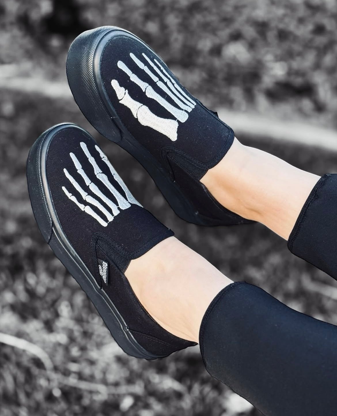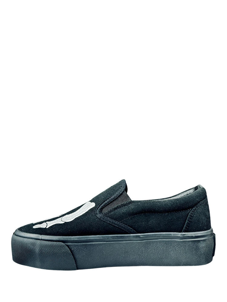 Elevate your style with Chill Bones. The chic black canvas upper adorned with embroidered foot bone detail offers a fun and unique touch, while the canvas lining and black rubber outsole provide comfort and durability. With a 1.5 inch platform, these shoes are perfect for any casual occasion.