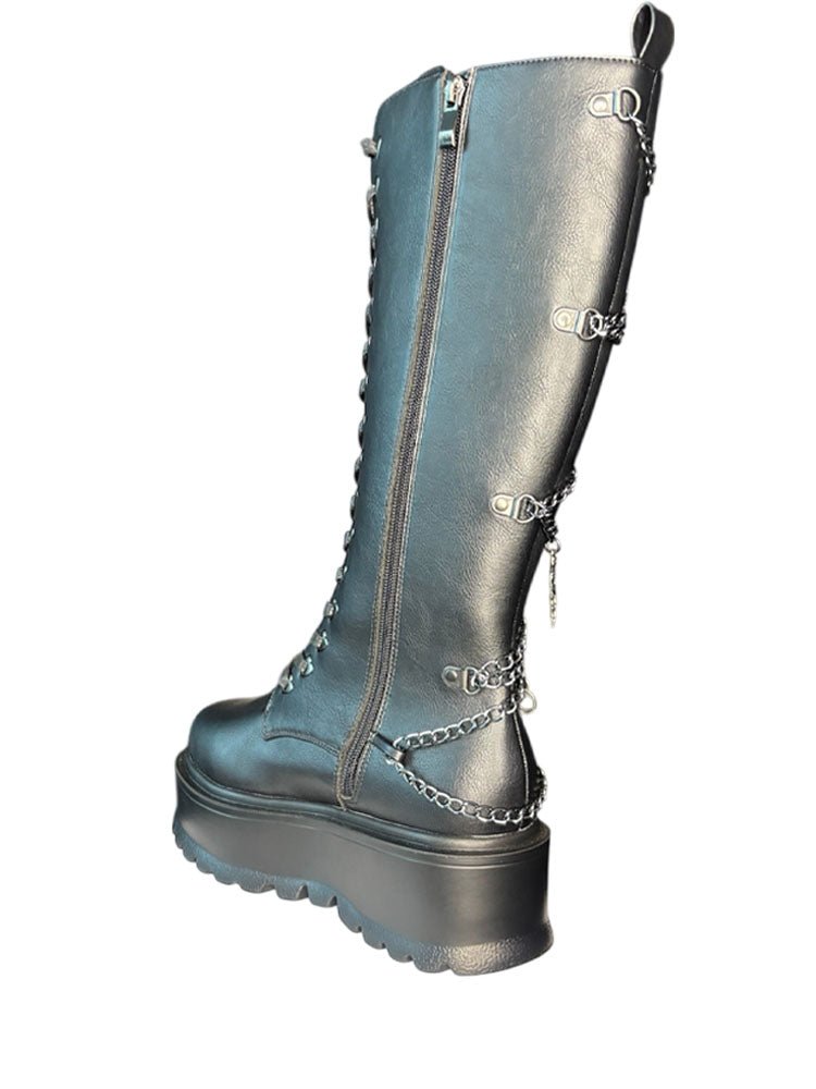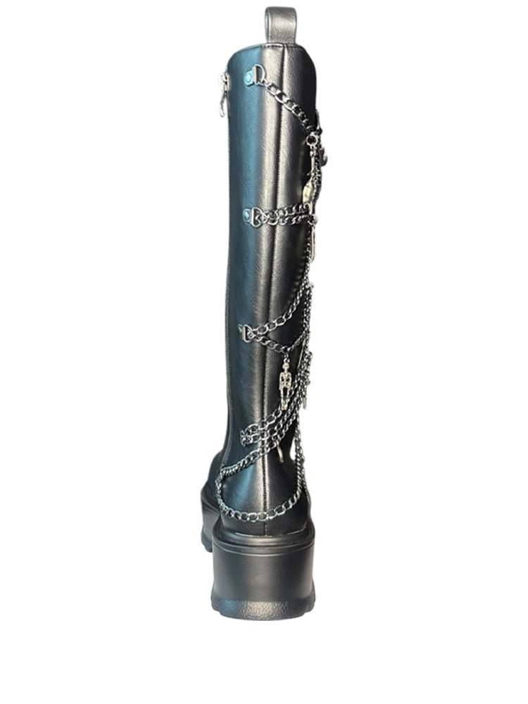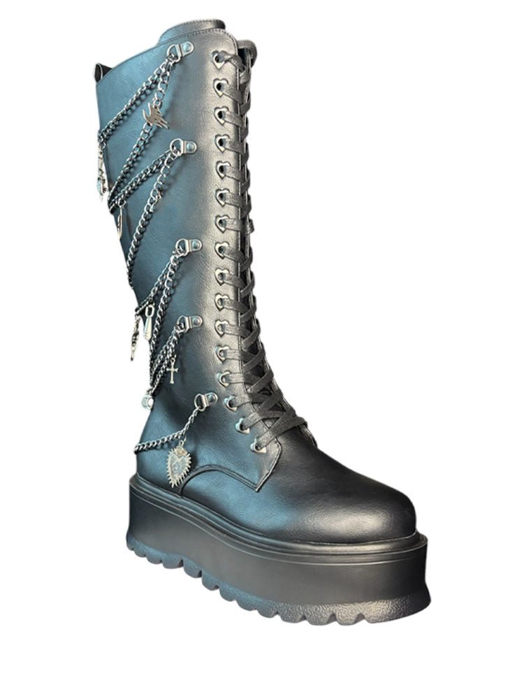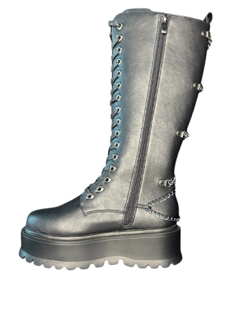 Women's Gothic Punk Knee High Combat Boots with stud, chain and charm detailing