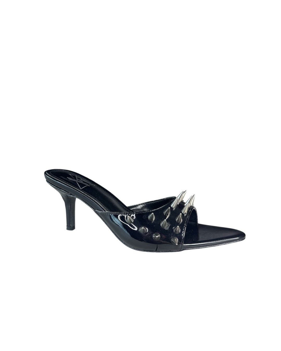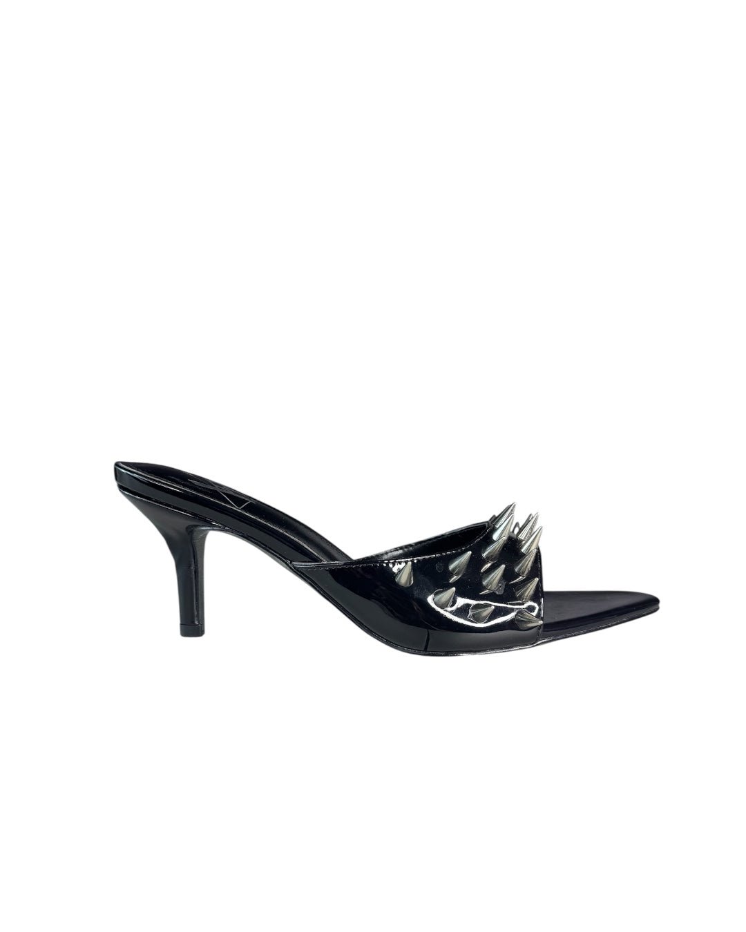 Step out with attitude in the KITTY - BLACK SILVER. Featuring a sleek black vegan leather upper adorned with striking silver spikes, this shoe blends rebellious style with cruelty-free materials. The glossy black patent leather sock adds a touch of shine, while the durable black rubber outsole ensures confident strides. Perfect for those who love to mix edgy details with playful flair.