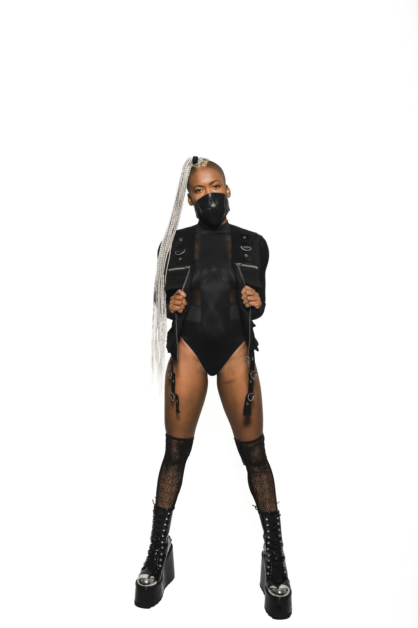 UNISEX CARGO VEST WITH TACTICAL POCKETS, EMBROIDERED LOGO, EYELET & O-RING BONDAGE STRAPS + ZIPPER DETAIL.