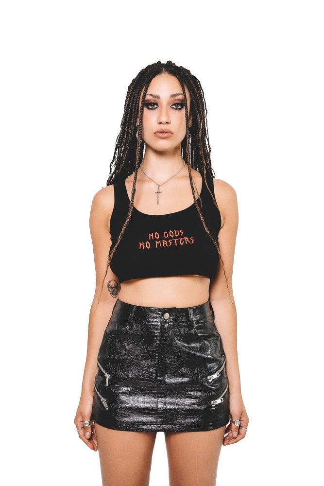 Vegan Leather, Black Crocodile Mini Skirt with Accent Zippers and Red Satin Lining.