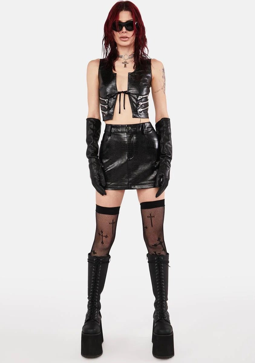 Vegan Leather, Black Crocodile Lace-Up Top with Accent Zippers and Red Satin Lining.