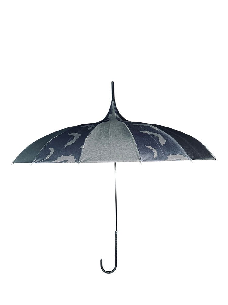 Brighten rainy days with the MARCELINE BAT PARASOL in black and grey! Its durable nylon upper keeps you dry, while the sleek black enamel metal handle adds a touch of edgy style. The vegan leather U-shaped handle offers comfortable grip, making this parasol as fun to hold as it is to show off. Stay dry and make a statement—rain or shine!