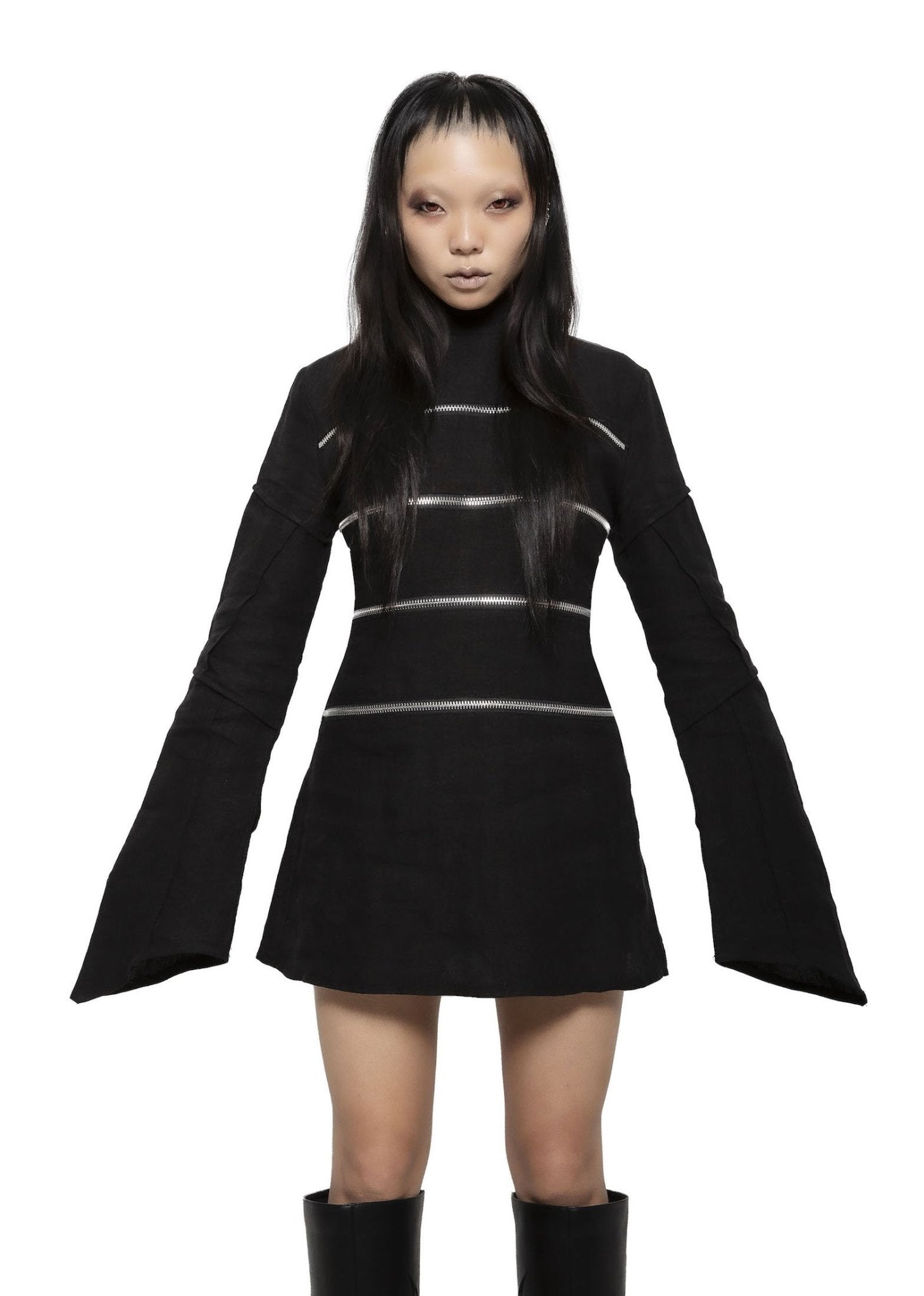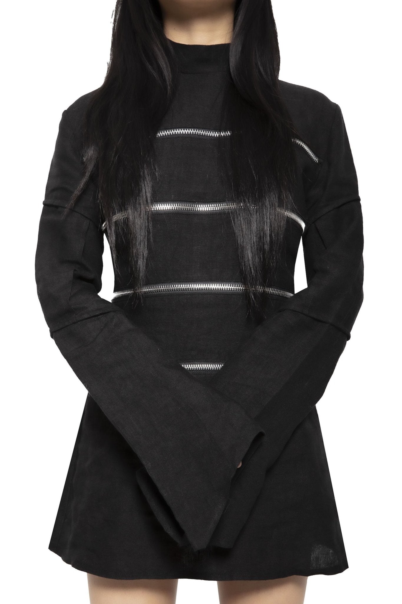 Mock Neck Linen Dress with Zippers + Asymmetrical Seam Bell Sleeves.