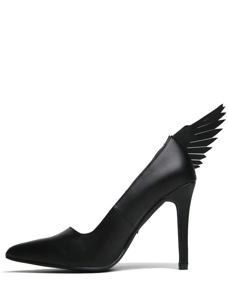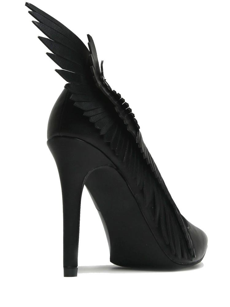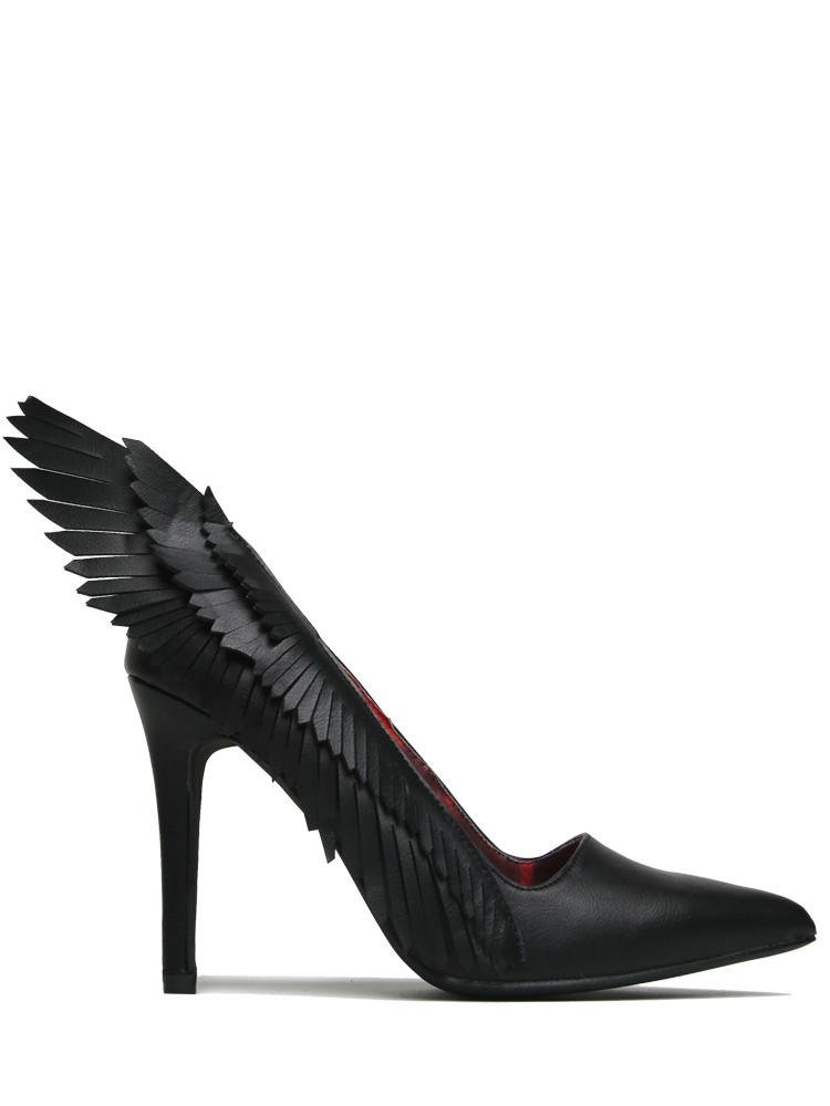 Step out with confidence in the ANGYL - BLACK, featuring sleek black vegan leather with chic angel wing details for a bold statement. The daring 4-inch stiletto heel lifts your look, while the black rubber outsole ensures you stay grounded with every step. Perfect for turning heads and embracing your playful side.